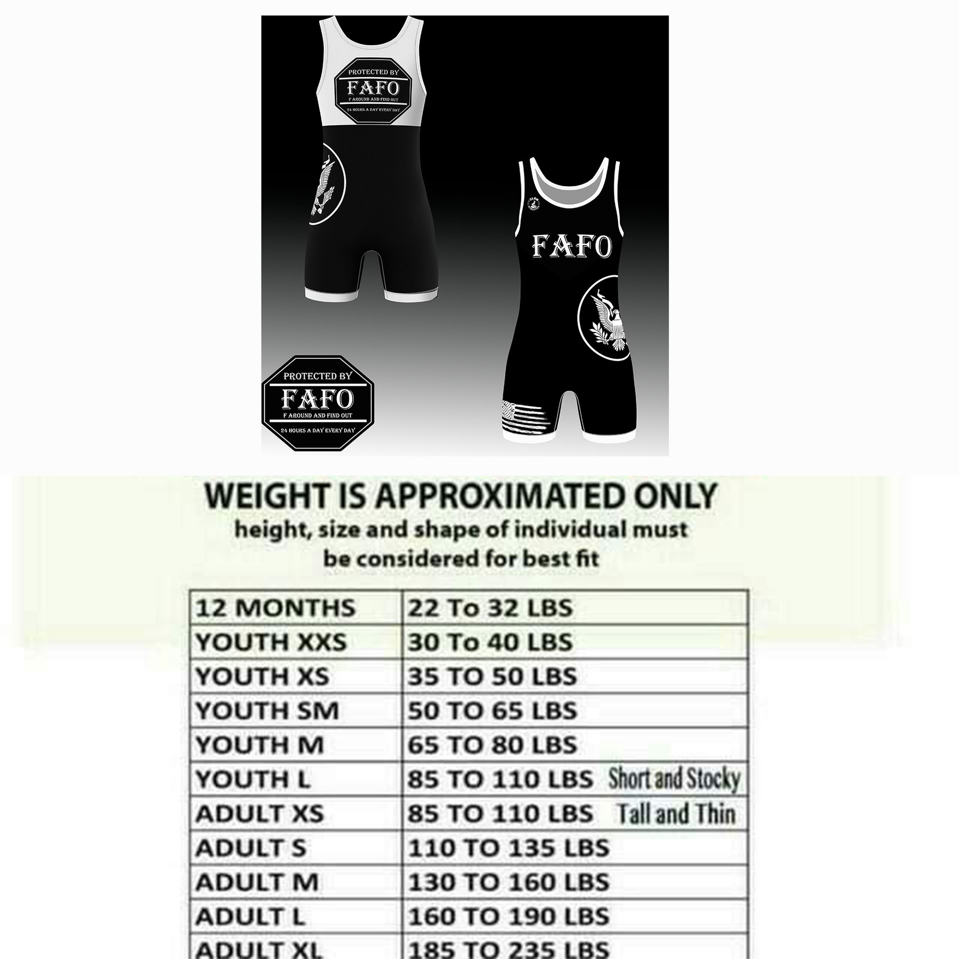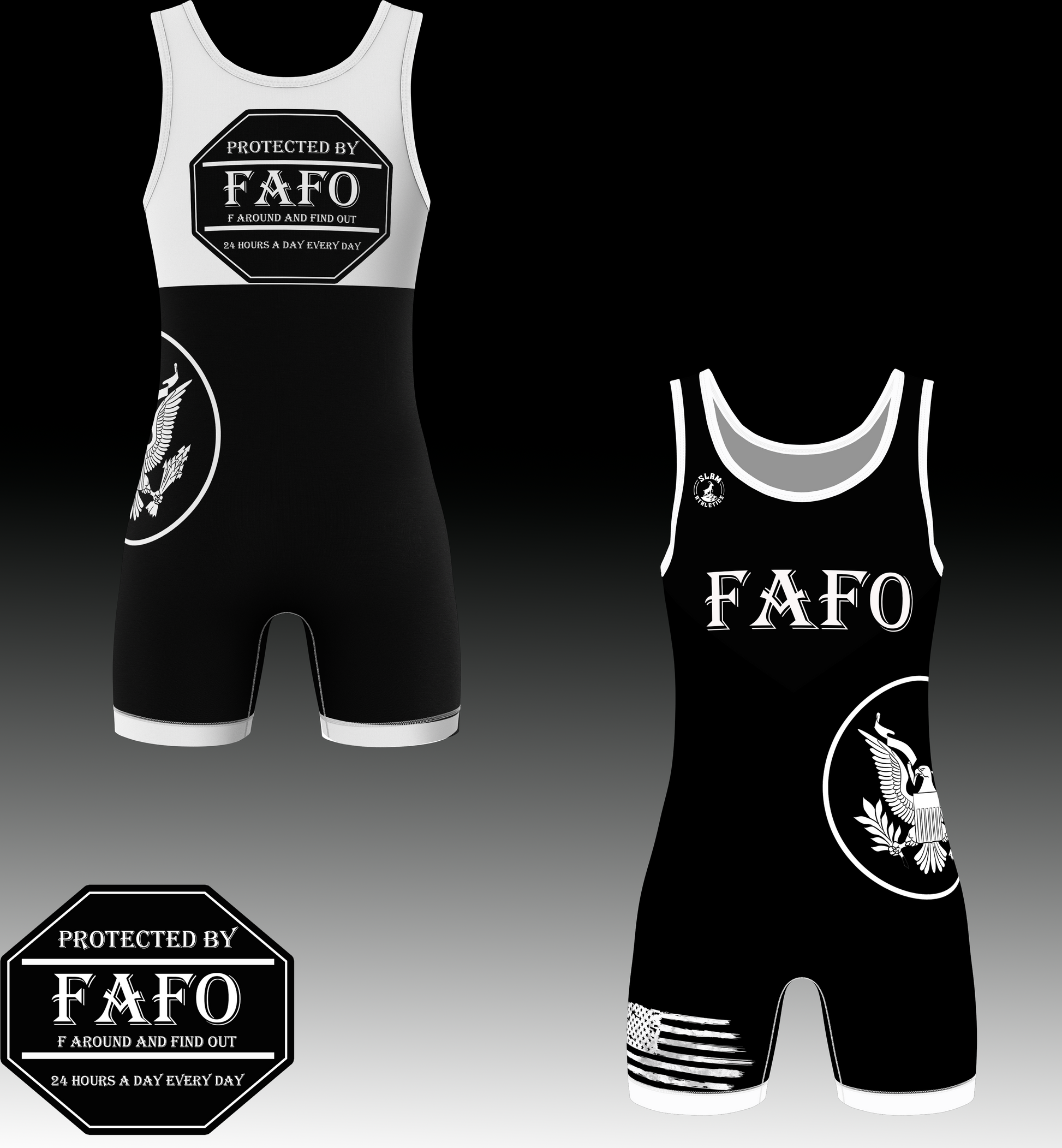 Unleash your bold style on the mat with the Special Edition FAFO Wrestling Singlet. Designed for champions who mean business, this sleek black-and-white singlet features striking graphics, including the FAFO emblem and a bold eagle symbol that represents strength and determination. Made with premium moisture-wicking, flexible fabric, it ensures maximum performance and comfort during your toughest matches.